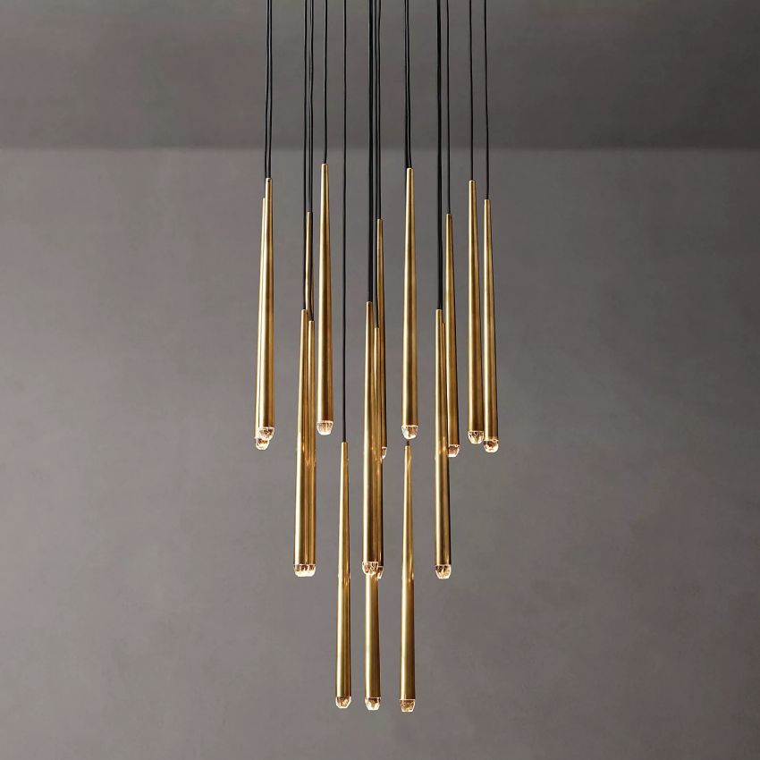 | Elegant design features a cluster of solid brass forms suspended from slender black cords. Inset LEDs at the faceted glass tips offer warm. glowing light. |