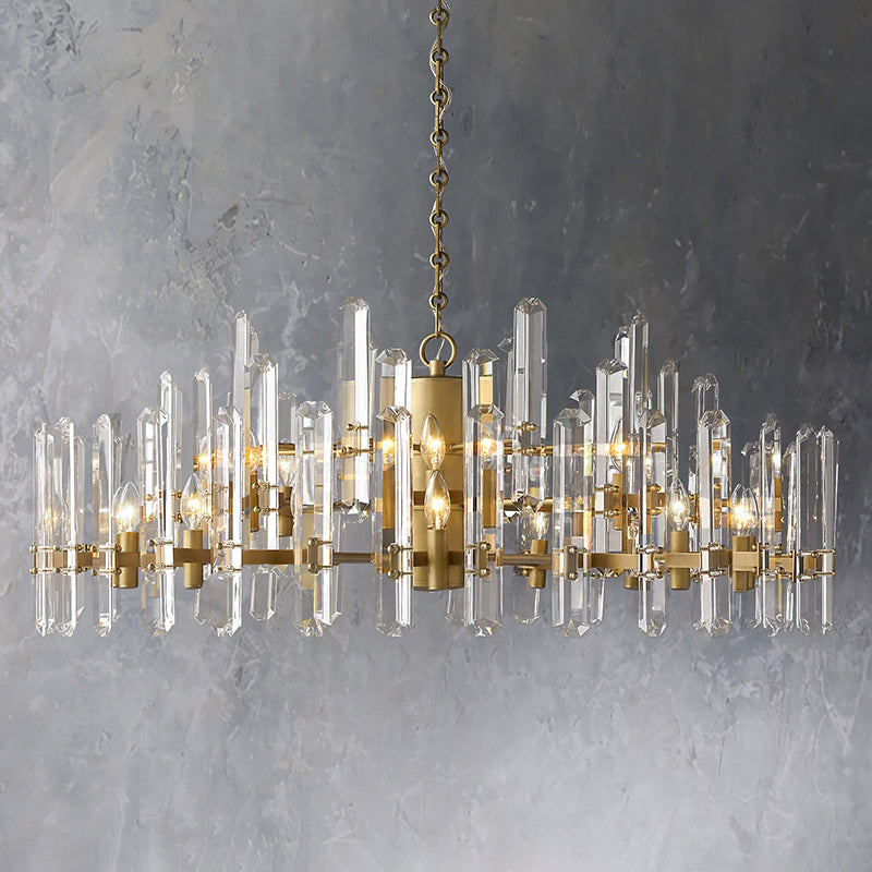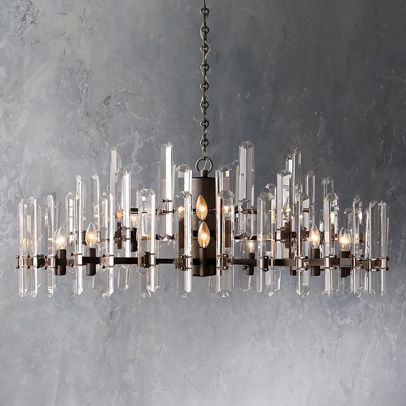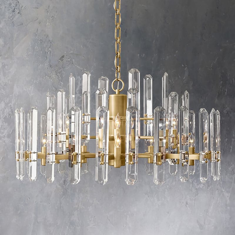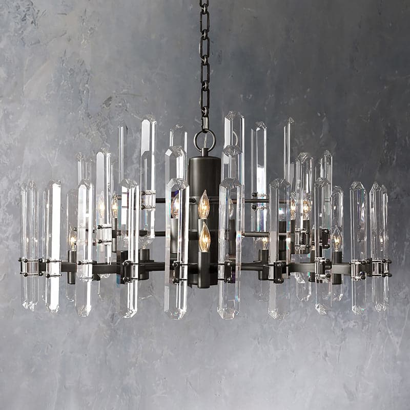 | Iron frame construction .Fitted with a spaced band of rectangular crystal glass prisms. secured at top and bottom with bold metal mounts . A band of faceted crystal glass prisms reflects and refracts the light. capturing the essence of emerald-cut diamonds. |