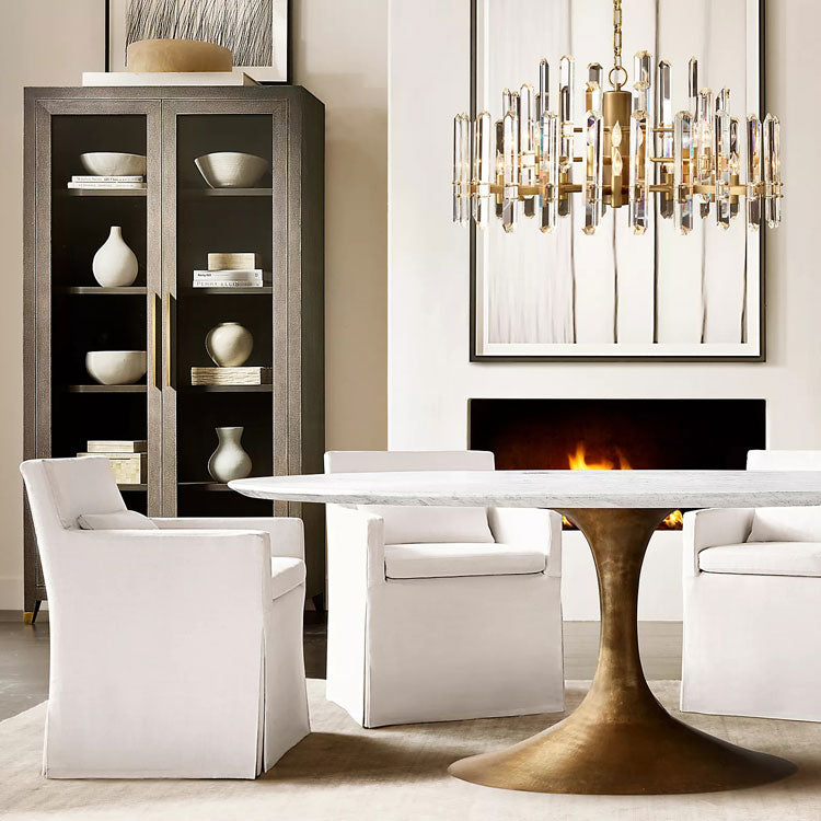 Chandeliers: As the centerpiece of the dining room, the chandelier should be wide enough to complement the size of the dining table but not so wide that it overwhelms the space. A diameter of 1/2 to 2/3 the table width is a good guide.