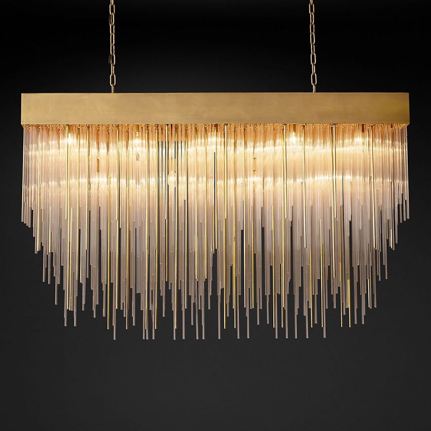 | A cascade of crystal and metal rods coexist in this dazzling display of light.Artfully evoking rainfall frozen in time. hundreds of slender tubes are suspended asymmetrically from a sleek canopy. casting a refractive glow to dramatic effect. |