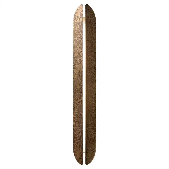 The Aare Gorge in Switzerland is testimony to natural erosion, shaped by the last ice age. Here, a river originating from melting glaciers once carved deep into the rock, cutting to its core. Thus, little by little, light began working its way into the cracks, amid ancient limestone stratifications. The manual erosion technique used on the metal sheet of Aare is its modern echo, recreating the natural look of the rock along its surfaces. Thanks to a centre slit, these wall sconces take on the archetypical form of earthly geography sculpted by ice, reproducing its prehistoric beauty, as if they too were forged centuries ago.