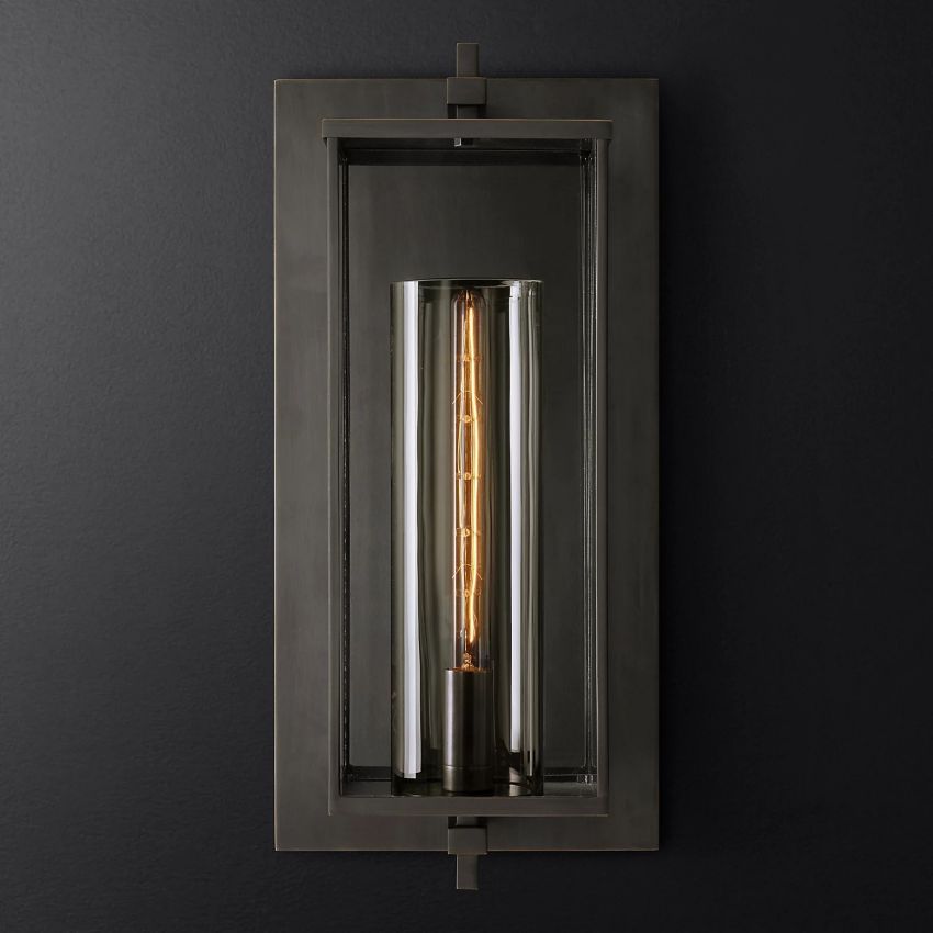 | With its refined play of lines and planes. this solid brass sconce is at once minimal and sumptuous. The light hovers away from the wall on a squared cross bar. seemingly weightless inside a glass box. The clear glass shade gives the impression of a pillar candle. the bulb just discernible within. |