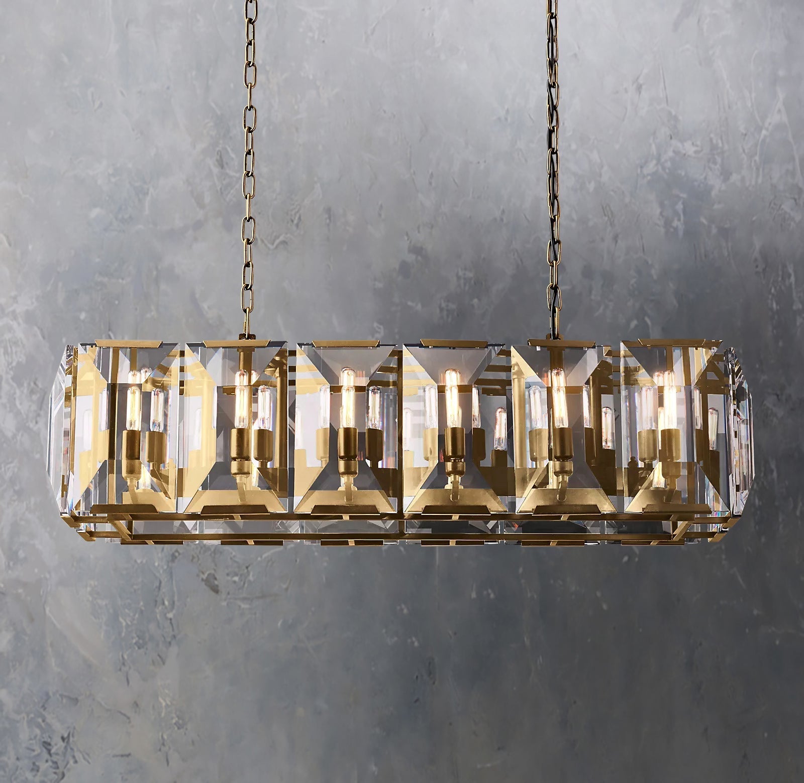 Our Chandelier evoke the boldness and glamour of 20th century German inspired chandeliers. A circle of faceted crystal glass prisms reflect and refract light. capturing the essence of an emerald-cut diamond. The light shimmers through the crystal glass.