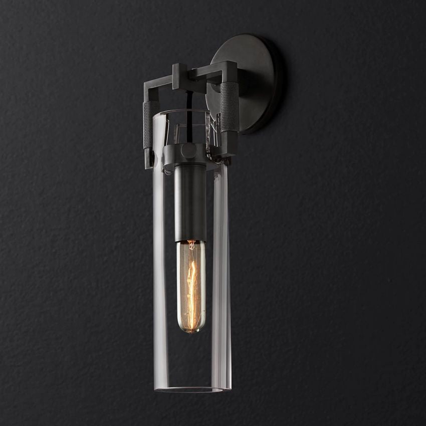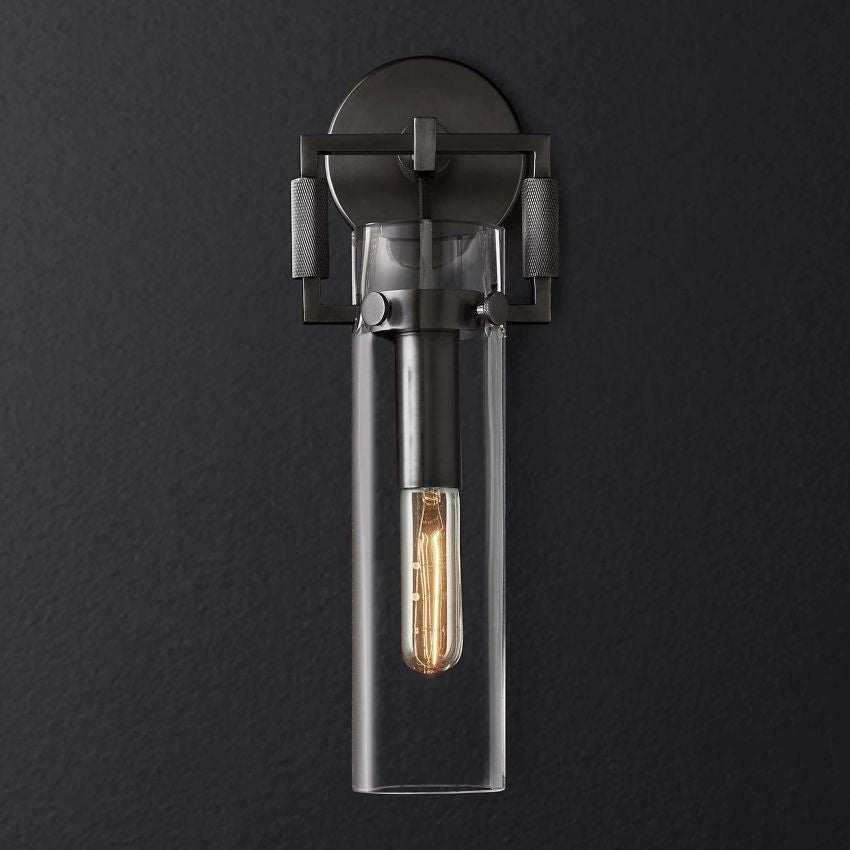 A study in positive and negative space. density and openness. strength and fragility. our Machinist Sconce is a yin and yang exploration. Crafted of solid metal. the geometric yoke reveals its industrial inspiration. In contrast. the clear glass surround is barely there. echoing the form of a shade. An Edison bulb housed within reveals arresting filaments of light. |