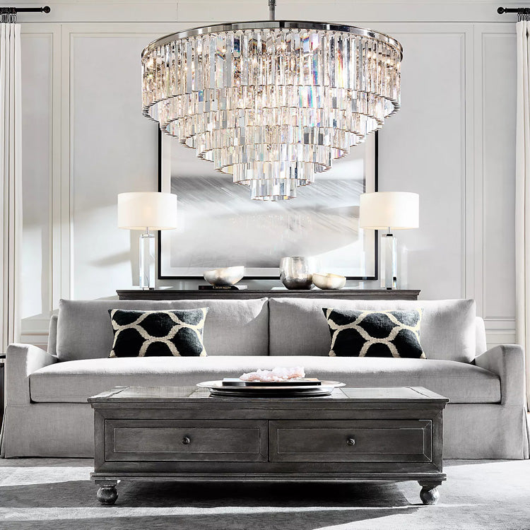 Chandeliers and Pendants: These are the focal points of the living room, especially in rooms with higher ceilings. To size appropriately, use the room dimension formula and ensure the fixture is in scale with the room’s layout. A general rule is to ensure there is at least 7 feet of clearance between the fixture and the floor.